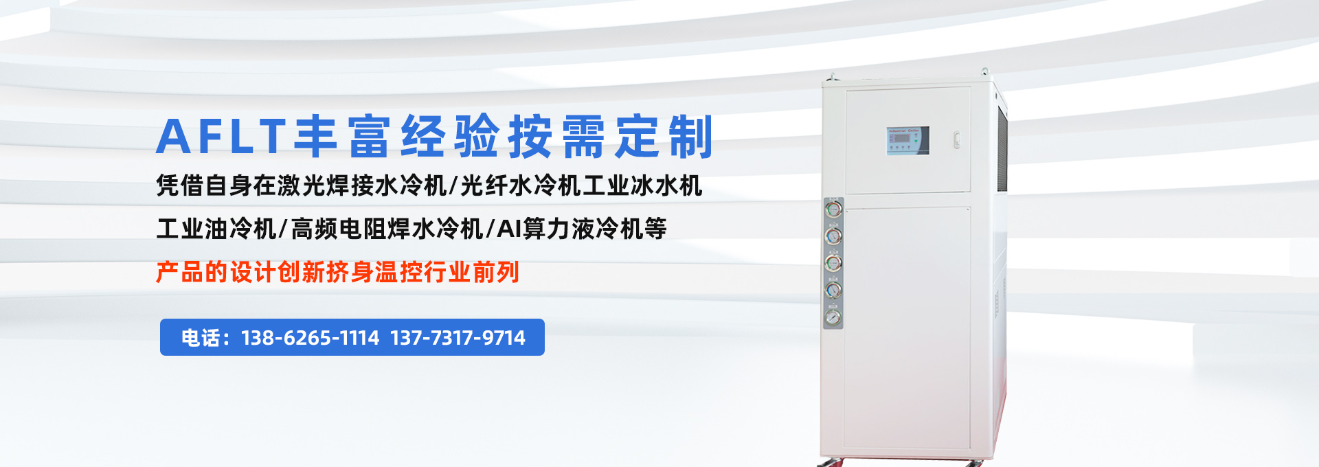 埃维塔温控技术(苏州)有限公司,AFLT专注于设计制造全系列,高精温控工业精品,一直以来AFLT以其丰富经验及对行业技术的不断革新对客户需求和行业的趋势前瞻能力,并凭借自身在激光焊接水冷机/光纤水冷机/工业冰水机/工业油冷机/高频电阻焊水冷机/AI算力液冷机等产品的设计创新挤身温控行业前列。